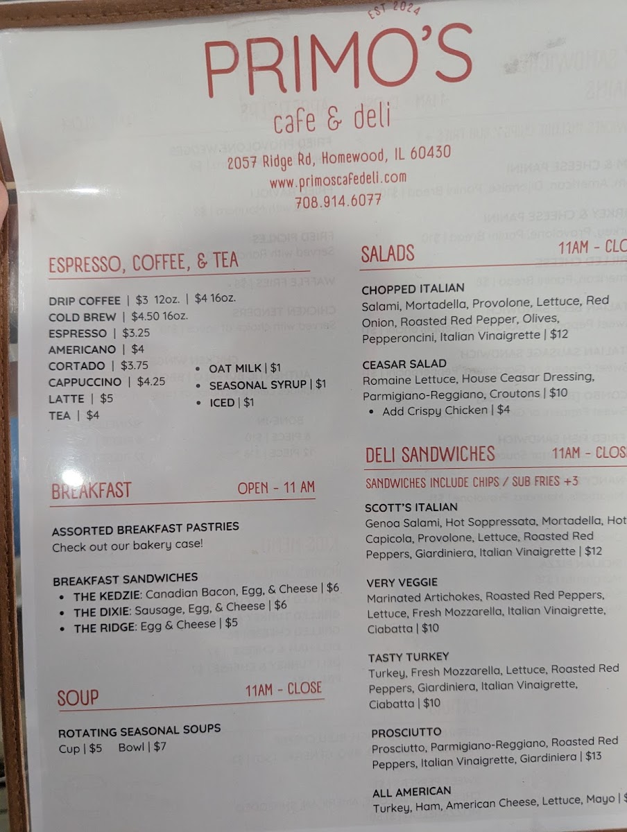 When you visit Primo's Cafe & Deli Menu at 2057 Ridge Rd in Homewood, you’re in for a treat. From the moment you step in, you’ll find a cozy, laid-back spot that feels like home. The menu is packed with hearty sandwiches, fresh salads, and comforting deli classics - all made with top-quality ingredients. Whether you're in the mood for a classic turkey club, a flavorful pastrami on rye, or a savory veggie wrap, there’s something to satisfy every craving. Don’t forget to check out the daily specials, offering a rotating selection of delicious bites you won’t want to miss. The atmosphere is casual, perfect for a quick lunch, a relaxed dinner, or grabbing something to go. Whether you’re a regular or a first-time visitor, Primo’s is the kind of place that will make you want to come back again and again.